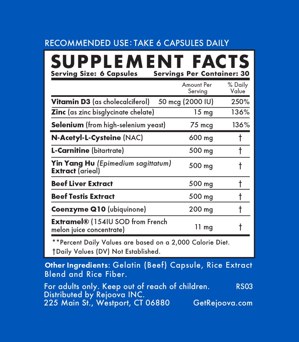 Rejoova Sperm utilizes clinically proven targeted nutrients to enhance testicular function and improves overall sperm quantity and quality. It is recommended that this product be combined with Rejoova Repair for better results.